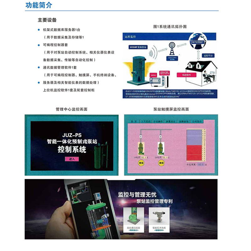 傳輸系統采用公共無線網絡GPRS,控制方式采用液位控制,現場手動控制、遠程控制,預留遠程控制接口,控制中心可監測水泵工作狀態,運行電流,水池水位,水泵故障報警,流量等參數, 可實現設備現場自動、手動控制轉換。